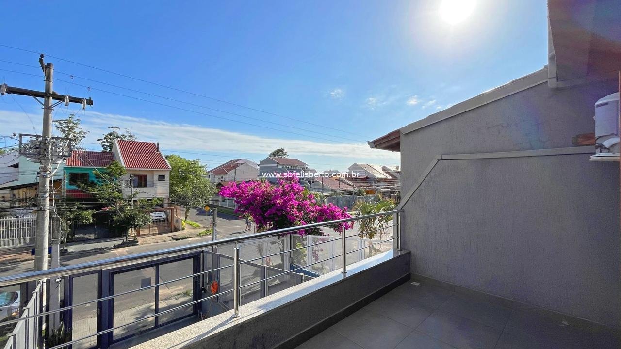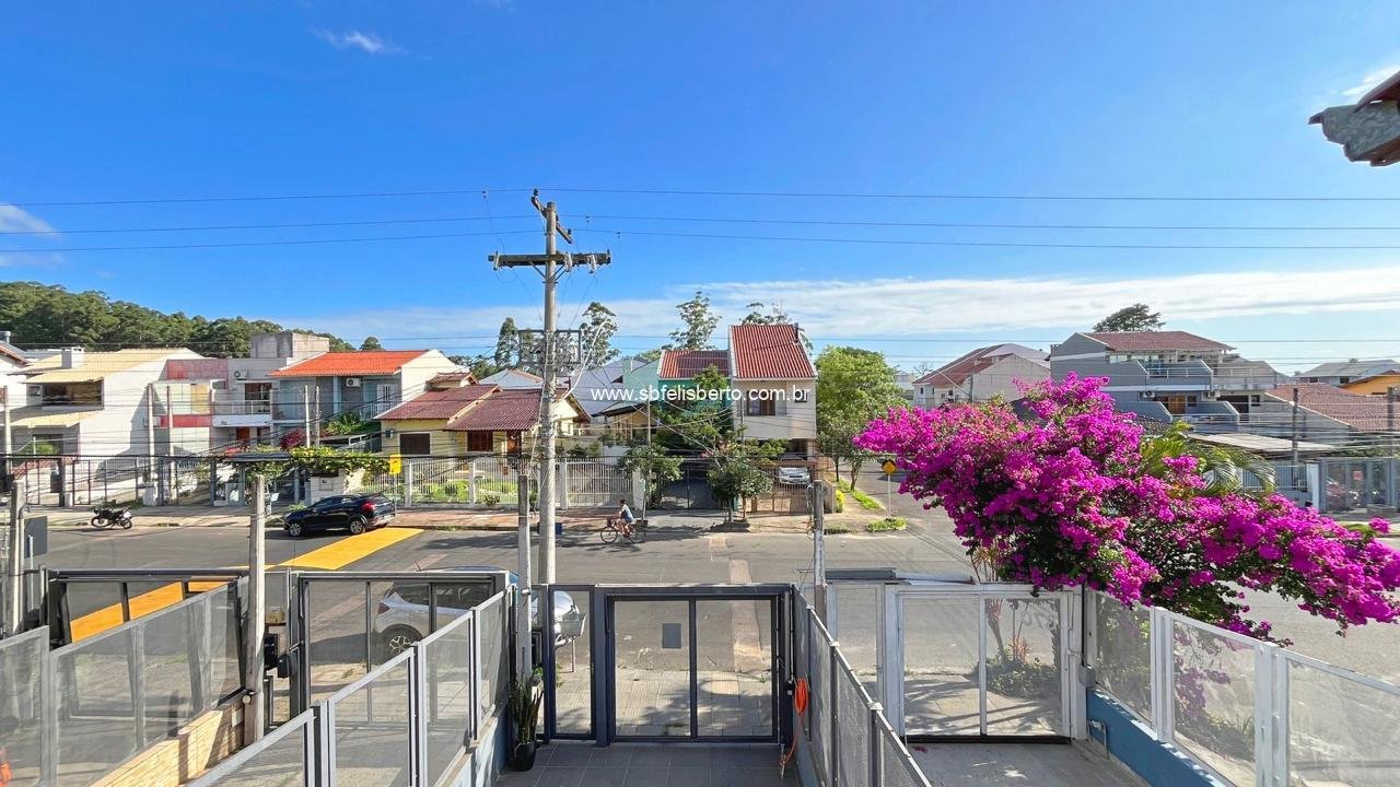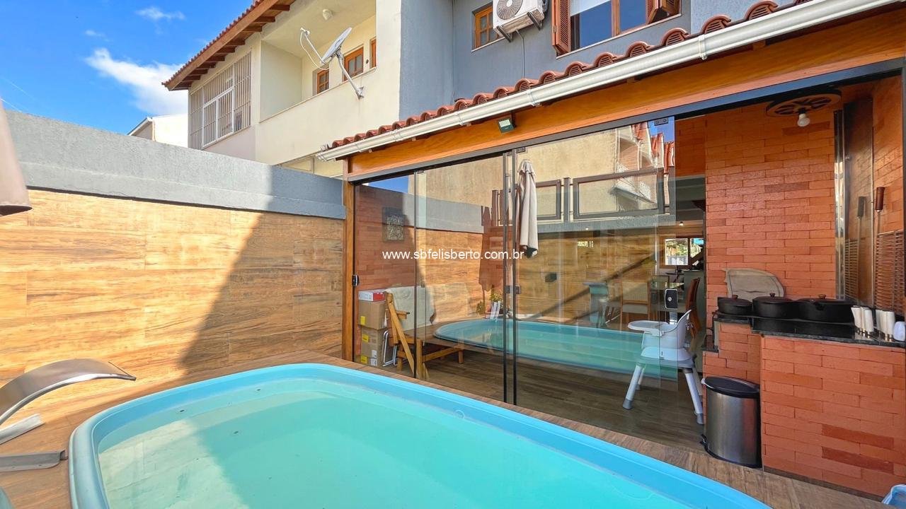 Sobrado com 3 suítes considerando o terceiro pavimento, total de banheiros 4 contando com lavabo, mais sala, cozinha, área de serviço, pátio, piscina , piso parcelado na parte térrea, segundo pavimento laminado, terceiro pavimento piso porcelanato, possui escadaria de madeira, sacada, terraço com vista para o Guaíba, vaga para 2 veículos, possui grade e portão eletrônico.